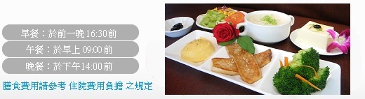 1. 當您辦好住院後,醫師會依照您的需要,開具膳食種類醫囑,若您不想接受醫院提供之膳食,請向護理站聲明。若要暫停供應或變更膳食種類,請於下列時間前通知護理站辦理: